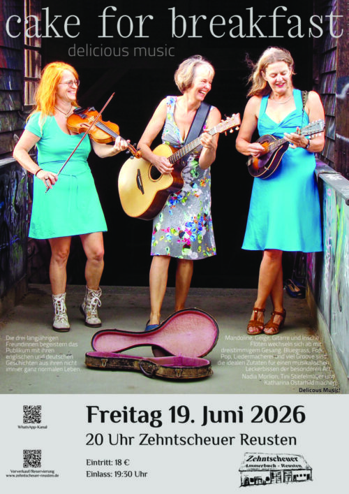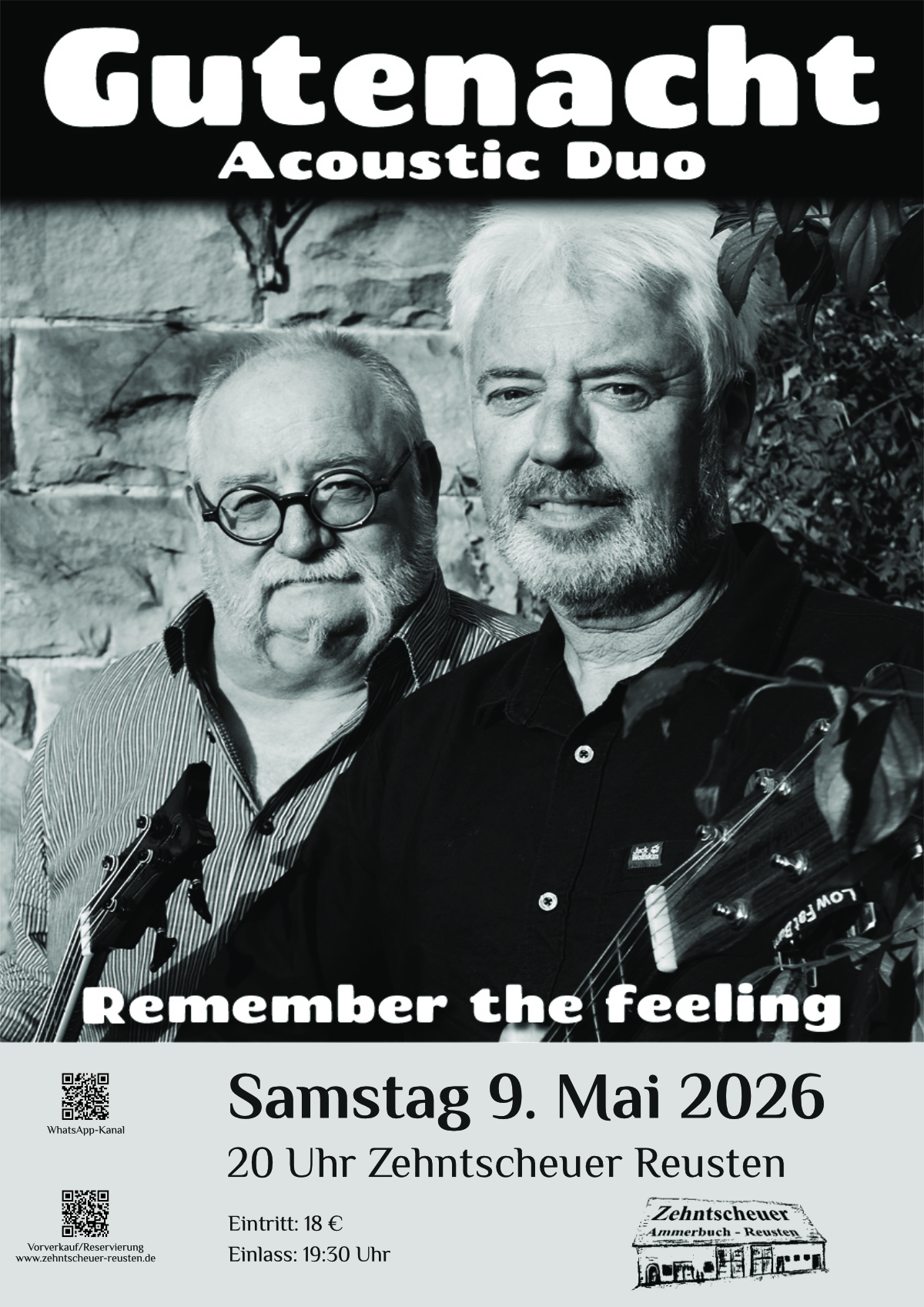 Für Kartenreservierungen/Vorverkauf bitte eine E-Mail unter Angabe der Veranstaltung und der Anzahl der gewünschten Plätze an: kartenreservierung@zehntscheuer-reusten.de
